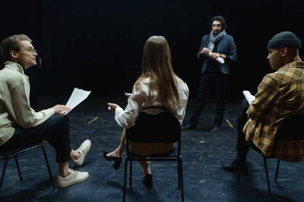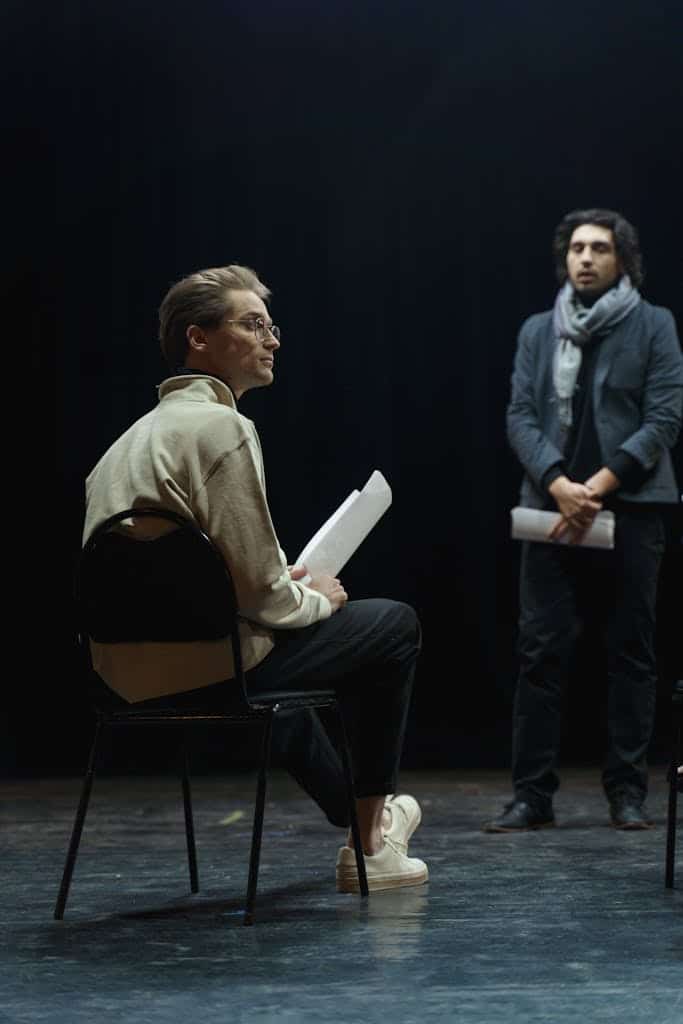 Actors rehearsing a scene with focus on character development and script analysis in a theater setting.